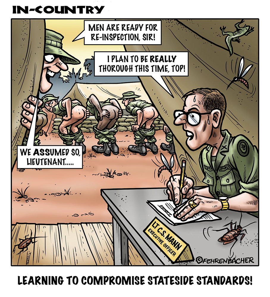Phil enlisted in the Army in 1965 where he served for years in Vietnam. He became a graphic designer and has worked for the state of Oregon for 26 years. He retired in 2003 and started the Cartoon "In-Country". The cartoons reflect his experiences during his tour of duty in South Vietnam.